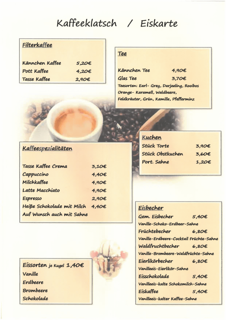 Ob frisch gebrühter Kaffee mit hausgemachtem Kuchen, ein bunter Eisbecher an warmen Tagen oder ein herzhaftes Schnitzel mit kühlem Bier – bei uns finden Sie zu jeder Tageszeit den passenden Genuss. Regional, zünftig und immer mit Liebe serviert.