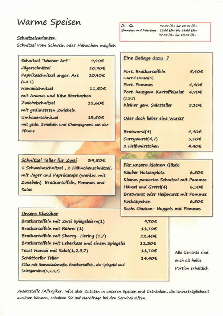 Herzhafte Schnitzel (Wiener, Jäger-, Paprika) mit Wunschbeilage wie Bratkartoffeln, Pommes und Salat sowie beliebte Hausmannskost: Bratkartoffeln mit Spiegeleiern, Matjes, Leberkäse und Toast Hawaii. Regional, zünftig und frisch zubereitet.