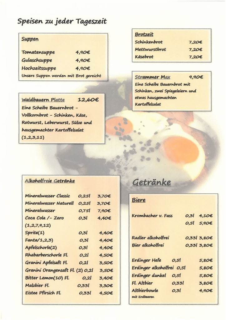 Für den kleinen und großen Hunger: Suppen, deftige Brotzeit und unser Strammer Max – dazu eine große Auswahl an Getränken: Mineralwasser, Limonaden, Säfte sowie Biere vom Fass und aus der Flasche. Frisch gezapft und gut gekühlt.