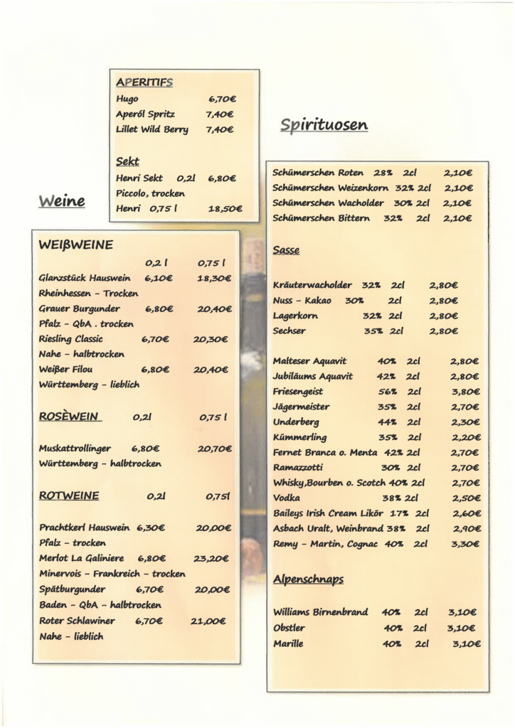 Ausgesuchte Weiß-, Rosé- und Rotweine, spritzige Aperitifs und prickelnder Sekt – dazu edle Spirituosen vom Kräuter- und Weinbrand bis zum Obstler. Perfekt temperiert und aufmerksam serviert.